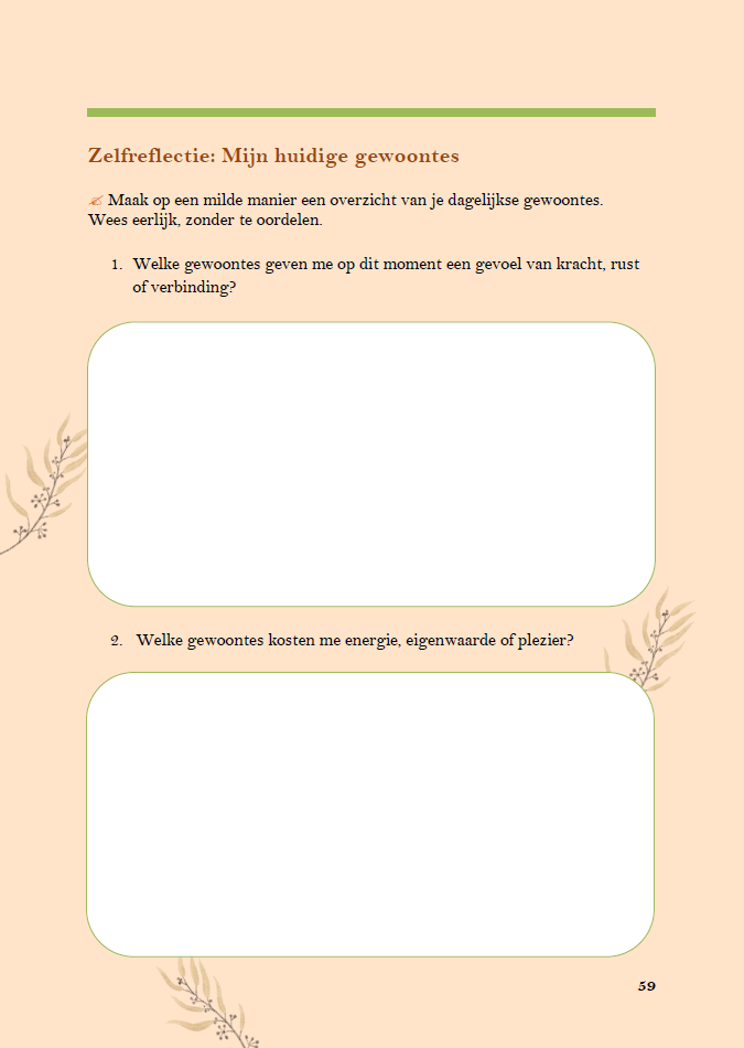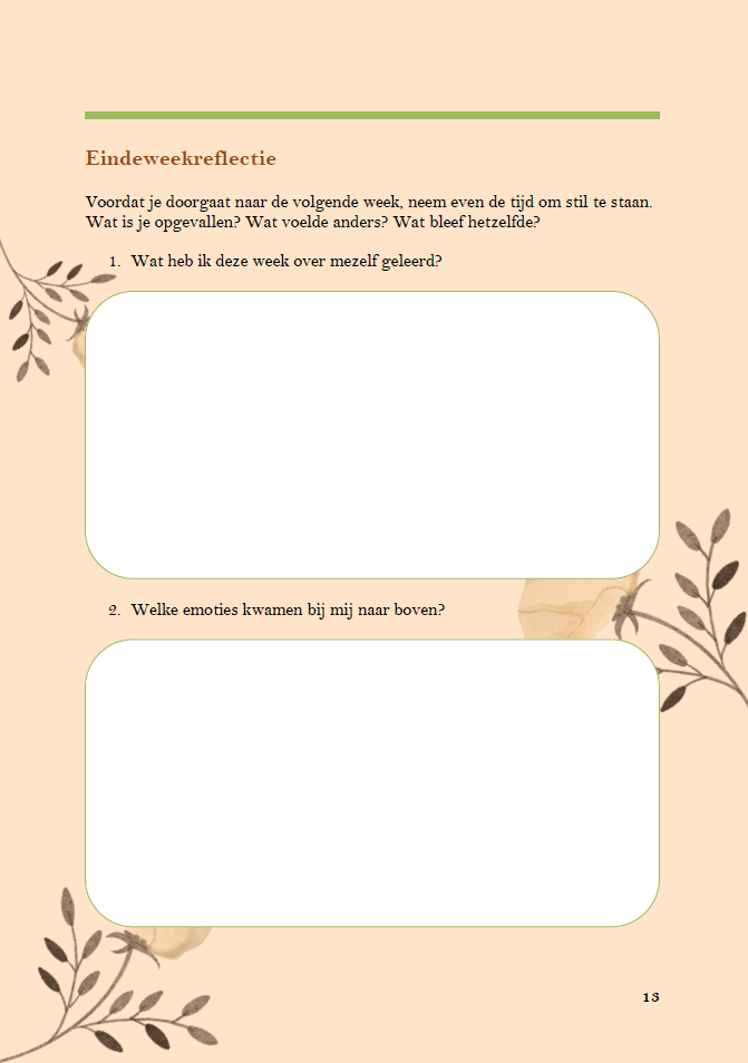 - Wekelijkse reflectievragen die je helpen eerlijk naar jezelf te kijken